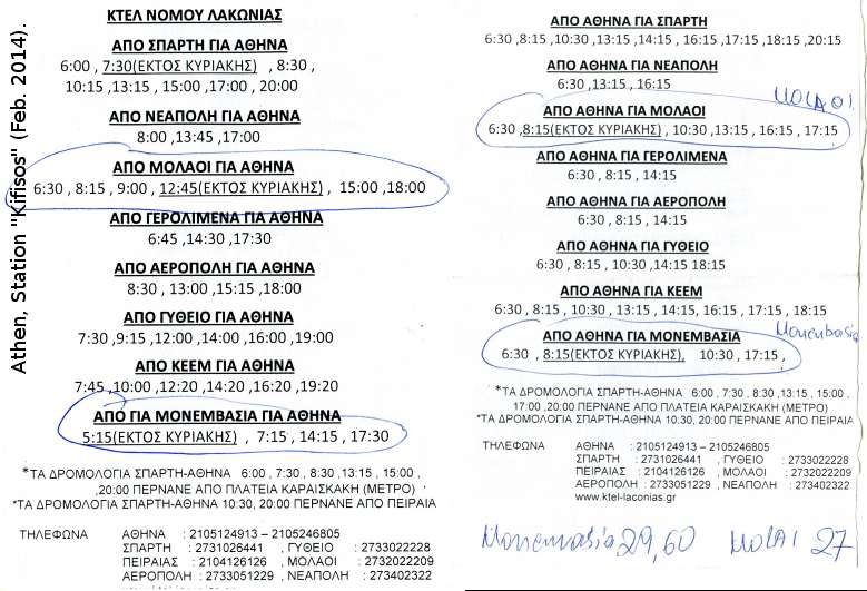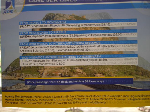 An der Tankstelle, vorne am Fuße des Felsens … Vom 15. April bis 12.Sept. gibt es eine Fährverbindung Athen (Piraeus, Dep. Fr., 18:00 Uhr) - Monemvasia - Kithira - Kreta. Die, bis Monemvasia 5:30 stündige Schiffsfahrt, kostet oneway 20 €, mit "Fahrzeug" +50 €. Weitere Abfahrtzeiten und Kontaktadressen siehe Fährfahrplan vom Februar 2011 (Foto T. Reinhardt). Für eilende Flugreisende: Vom Flughafen fährt ein Bus ca. 40min direkt nach Piraeus, für 5€. Im Winterhalbjahr (z.B. Mitte März) gibt es auch Fährverbindungen, aber seltener.