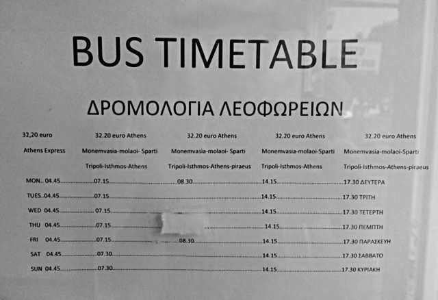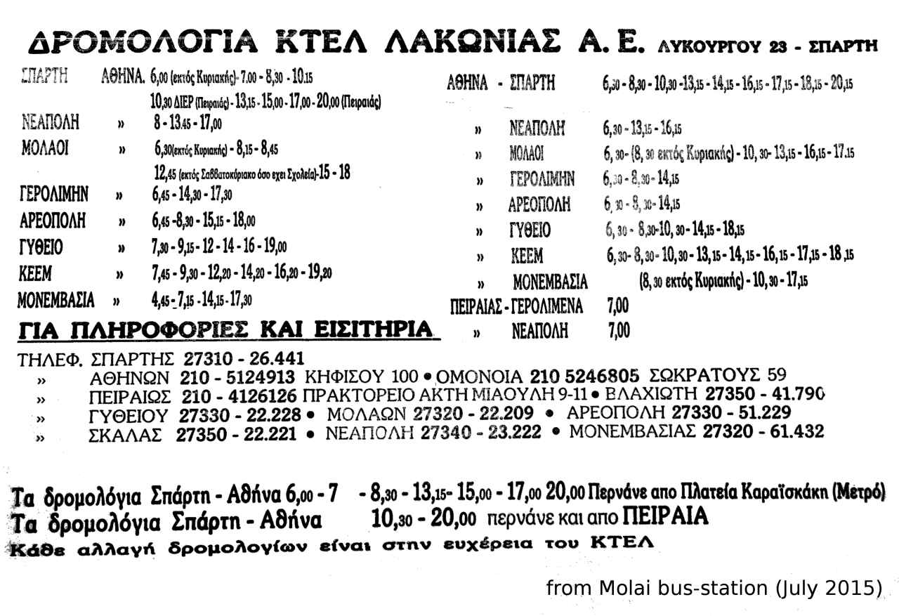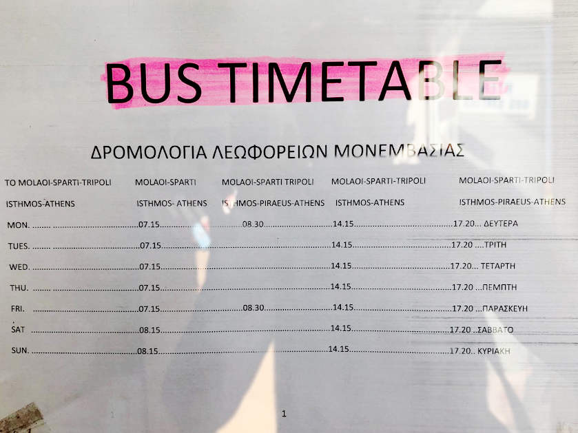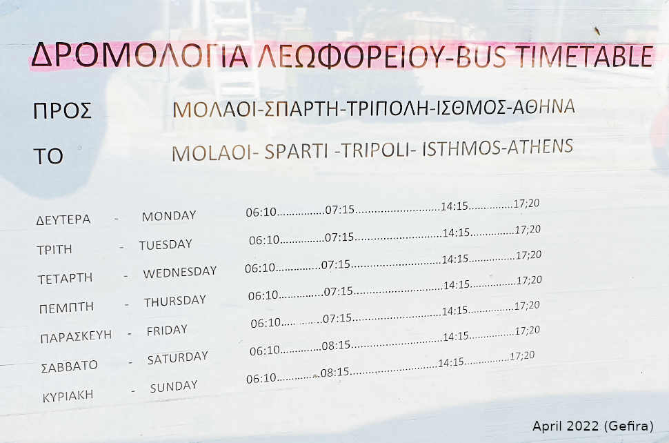 Jetzt 100 m Richtung Felsen/Hafen, etwa gegenüber vom Kiosk. Hier halten die Busse und hier gibt es Tickets & Auskünfte (griech., engl.): Busfahrpläne auf KTEL-Webseite (Athens - Isthmos - Tripoli - Sparti - Skala - Molaoi - Monemvasia: i.R. ca. 5 Stunden Monemv. bis Isthmos), ca. € 32,50. In Isthmos kann man umsteigen nach Patras; Busse fahren stündlich. Isthmos - Patras dauert ca. 2,5 Stunden. Busfahrplan Aushang April 2022 (Monem.). (Alte Busfahrpläne: Juli 2020, Juli 2018, Juli 2016, Juli 2015, Juli 2014, Mai 2014, August 2011, Juli 2010, März 2009). Athen: Ein Busfahrplan Athen - Monemvasia von Februar 2014 vom Fahrkarten-Schalter in Athen, von der Station "Kifisos" (KTEL Athens Bus Station, Terminal A, Geokoordinaten 37.998, 23.699), wo Überlandbusse abfahren/ankommen. Die Station ist vom Flughafen mit dem Öffentlichen Nahverkehr in 1,5 Std., mit dem Taxi in ca. 30 Min. erreichbar.